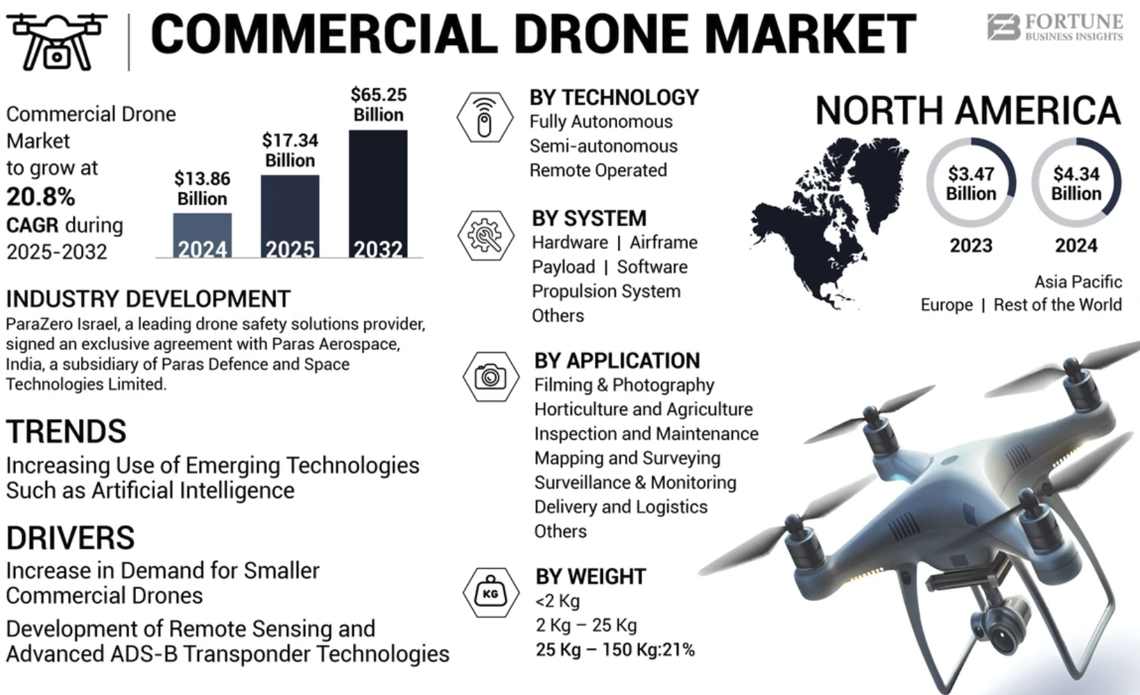 | Civil vs militaire : volume contre valeur unitaire L’opposition civil/militaire structure profondément l’industrie. ➡️ Le segment civil représente aujourd’hui environ 60 à 65 % des volumes, tiré par l’intégration industrielle et la baisse des coûts technologiques. Il est aussi le principal moteur du développement des services et de la donnée. ➡️ Le segment militaire, en revanche, représente une part plus élevée de la valeur unitaire. Les investissements dans l’autonomie, la résilience des communications et les capacités offensives stimulent l’innovation technologique. À l’horizon 2035, la part militaire pourrait représenter 30 à 35 % de la valeur totale, en fonction de l’environnement géopolitique. La frontière entre les deux se brouille technologiquement : les briques logicielles, l’IA et les capteurs sont dual-use. Recomposition régionale : leadership nord-américain, montée asiatique, consolidation européenne En 2024 : ➡️ Amérique du Nord : ~39 % du marché ➡️ Asie-Pacifique : ~30–35 % ➡️ Europe : ~20–25 % En 2030, l’Amérique du Nord pourrait atteindre 62 Md$, l’Asie-Pacifique environ 49 Md$. À horizon 2035, si le marché global atteint environ 240–250 Md$, la répartition probable serait : ➡️ Amérique du Nord : 85–95 Md$ ➡️ Asie-Pacifique : 80–90 Md$ ➡️ Europe : 50–60 Md$ ➡️ Autres régions : 20–30 Md$ On observe ainsi un rebalancement progressif vers l’Asie-Pacifique, soutenu par les capacités industrielles et les dynamiques géopolitiques régionales. En conclusion, l’industrie mondiale des drones est entrée dans une phase de maturité industrielle accélérée. D’un marché de 73 Md$ en 2024, elle devrait atteindre 163,6 Md$ en 2030, puis probablement dépasser 240 Md$ en 2035. Sa structuration repose sur : ➡️ La domination persistante de l’aérien, ➡️ L’accélération maritime, ➡️ L’extension terrestre, ➡️ La montée en puissance du counter-UAV, ➡️ Et surtout le basculement vers les services et la donnée. Le drone n’est plus un objet : il est devenu un infrastructure mobile de captation et d’exploitation de données, au croisement de l’industrie, de la sécurité et de la géopolitique. |