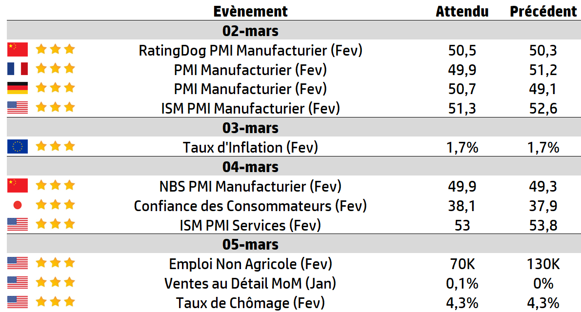 | Les chiffres de l’emploi aux États-Unis dominent la semaine, avec en point d’orgue la publication vendredi du rapport sur les salaires, mais les chiffres mensuels de l’ISM américain sont également publiés, ainsi que différents PMI mondiaux. Cela marque le retour au premier plan des données économiques, après plusieurs semaines consacrées aux résultats financiers. La principale entreprise américaine à publier ses résultats cette semaine est Broadcom, dont les actions sont en difficulté depuis septembre. |