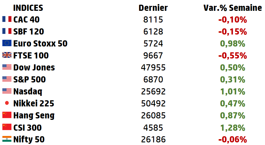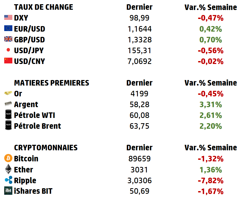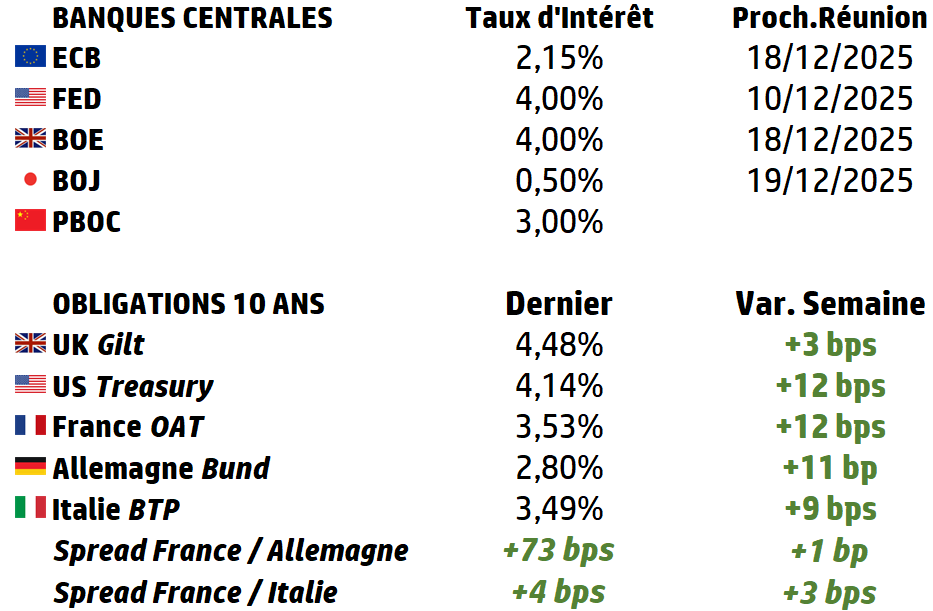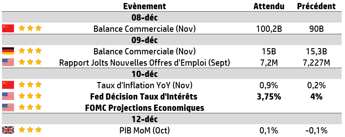 | Cette semaine, la Réserve fédérale américaine (Fed) publiera sa dernière décision pour 2025, et une baisse de 25 points de base semble presque certaine, les marchés boursiers ayant rebondi ces dernières semaines en anticipation de cette décision. Les banques centrales australienne et canadienne se réuniront également, mais elles devraient laisser leurs taux inchangés. L’inflation chinoise et le produit intérieur brut (PIB) britannique sont d’autres points à surveiller. Par ailleurs, l’actualité des entreprises est limitée, avec Gamestop, Oracle et Broadcom qui publient leurs résultats. |