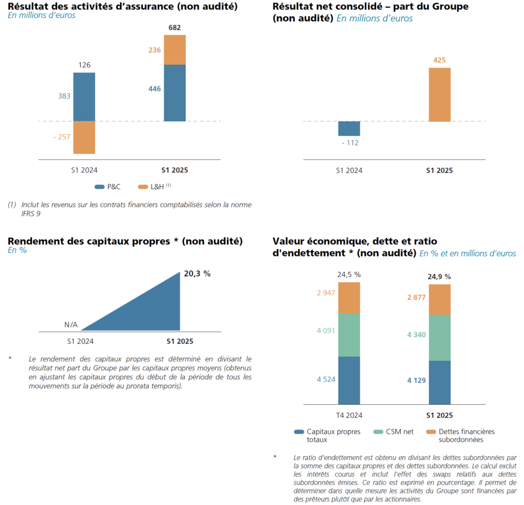 L’examen du Rapport Financier Semestriel 2025 met en lumière un retournement significatif. En effet, SCOR passe d’une perte de –112 M€ au S1 2024 à un résultat net de 425 M€ au S1 2025.