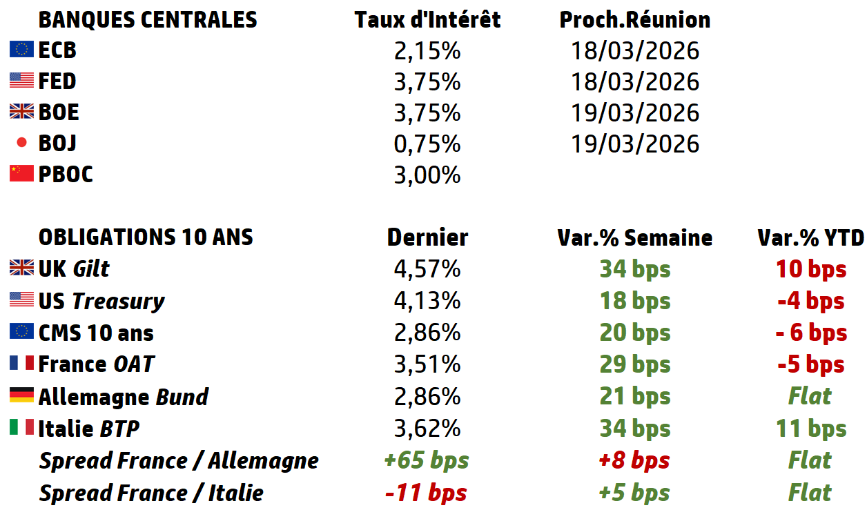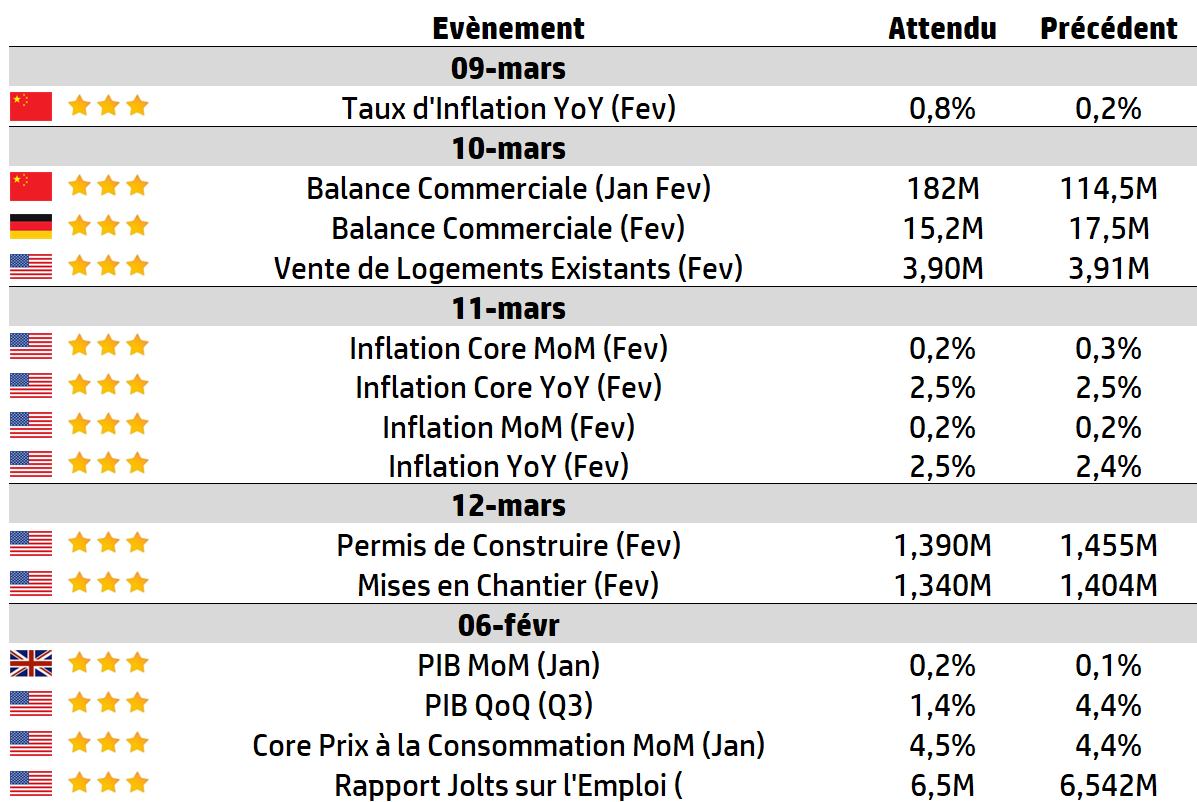 | L’inflation américaine et chinoise seront les données clés à surveiller cette semaine, même si les chiffres ne couvrent que le mois de février et que l’impact de la flambée des prix du pétrole cette semaine ne devrait donc pas apparaître. La saison des résultats aux États-Unis commence à ralentir, mais Oracle publie ses résultats cette semaine, tandis qu’en Allemagne ET en France, Rheinmetall, Vivendi et Eurazeo publient leurs résultats. |