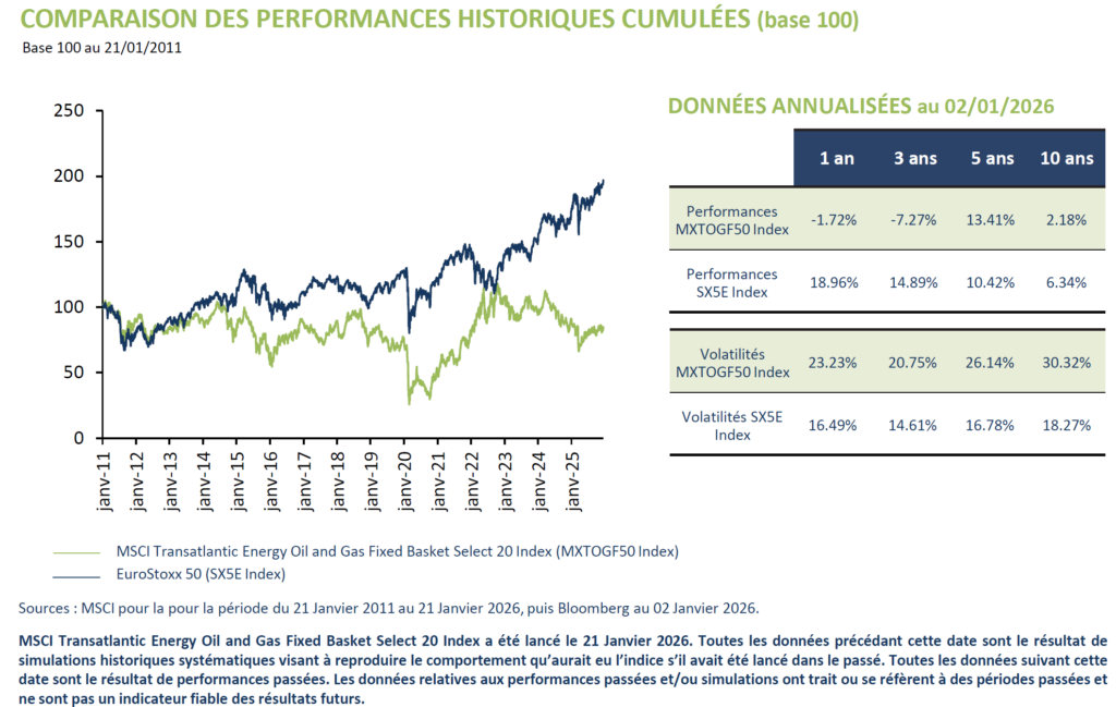 L’indice MSCI Transatlantic Energy Oil and Gas Fixed Basket Select 20 Index est composé de 20 entreprises avec une exposition transatlantique au secteur de l’énergie.