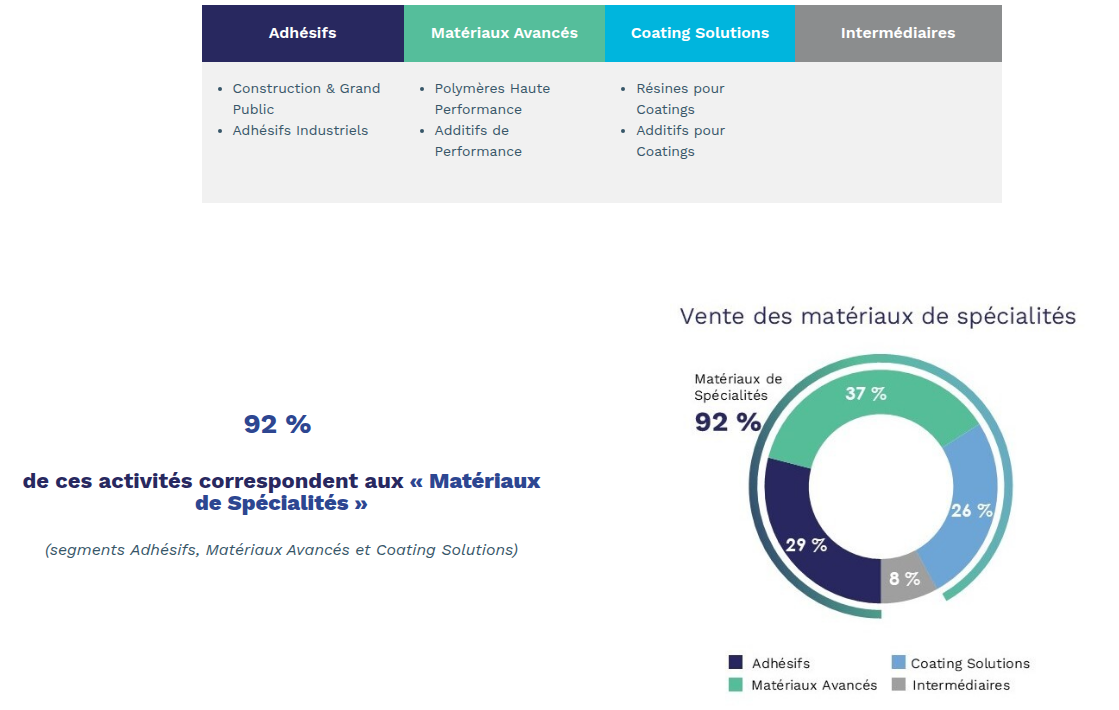 Organisé autour de trois segments cohérents et complémentaires dédiés aux Matériaux de Spécialités (les Adhésifs, les Matériaux Avancés et les Coating Solutions) qui représentent 92 % de ses ventes, et d’un segment Intermédiaires bénéficiant de lignes de produits compétitives et mondiales, le Groupe réalise un chiffre d’affaires de 9,5 milliards d’euros.