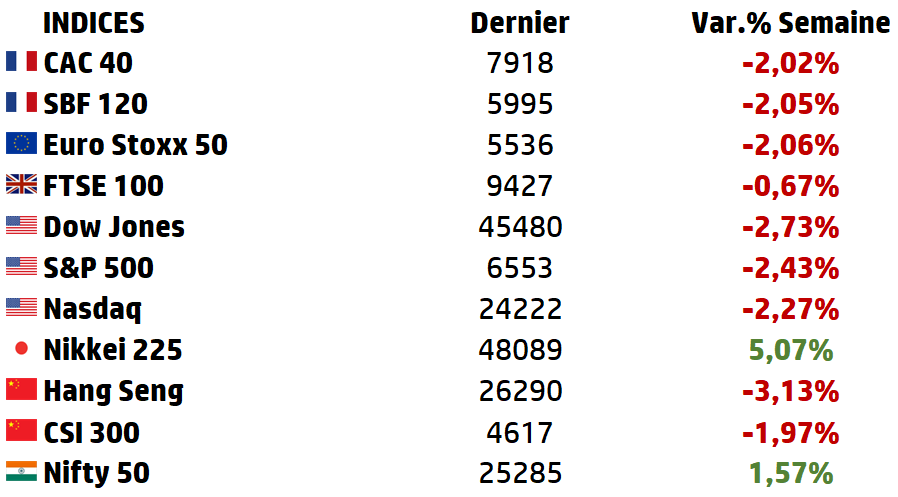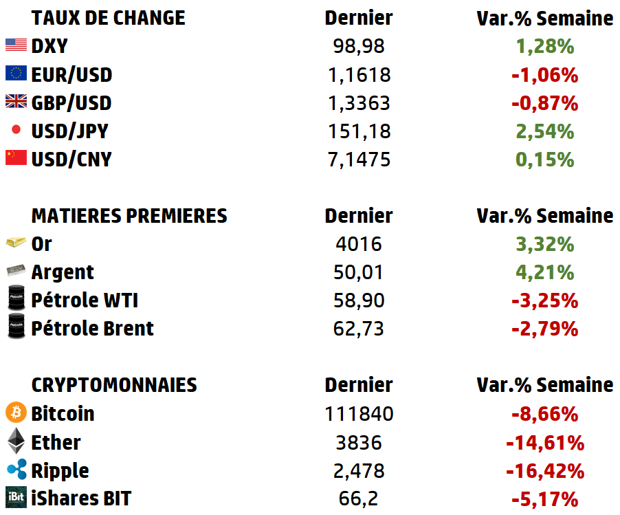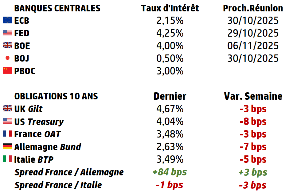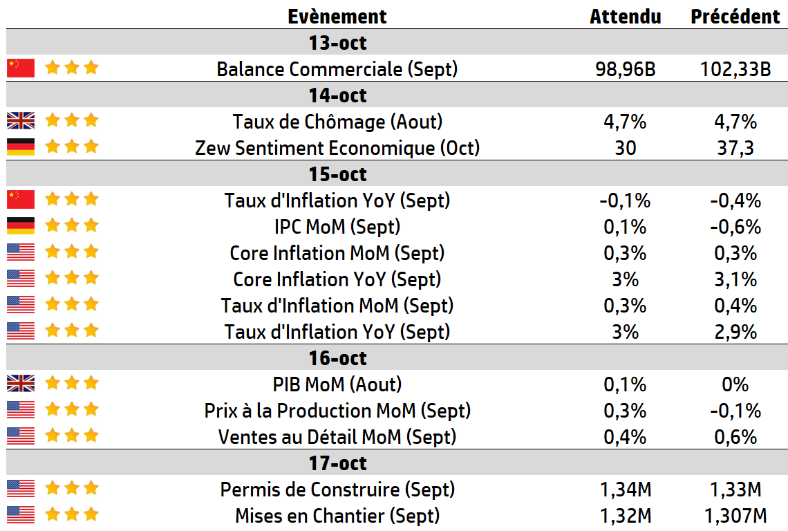 | Alors que les marchés boursiers américains atteignent de nouveaux records, la saison des résultats financiers aux États-Unis et en France démarre véritablement cette semaine. Aux USA, sont attendues les publications des chiffres du troisième trimestre (T3) des banques et en France, entre autres, celles de, LVMH, Danone, Essilor. Les données sur les entreprises britanniques sont également nombreuses, notamment celles du constructeur immobilier Bellway, de la société minière Rio Tinto et de l’opérateur hôtelier Whitbread. Les chiffres importants de l’inflation américaine seront toujours publiés cette semaine malgré la fermeture des services publics, mais les chiffres hebdomadaires des demandes d’allocations chômage devraient être retardés. Enfin, l’indice Zew Allemand, sera attentivement scruté après les mauvais chiffres de production industrielle publiés la semaine dernière. |