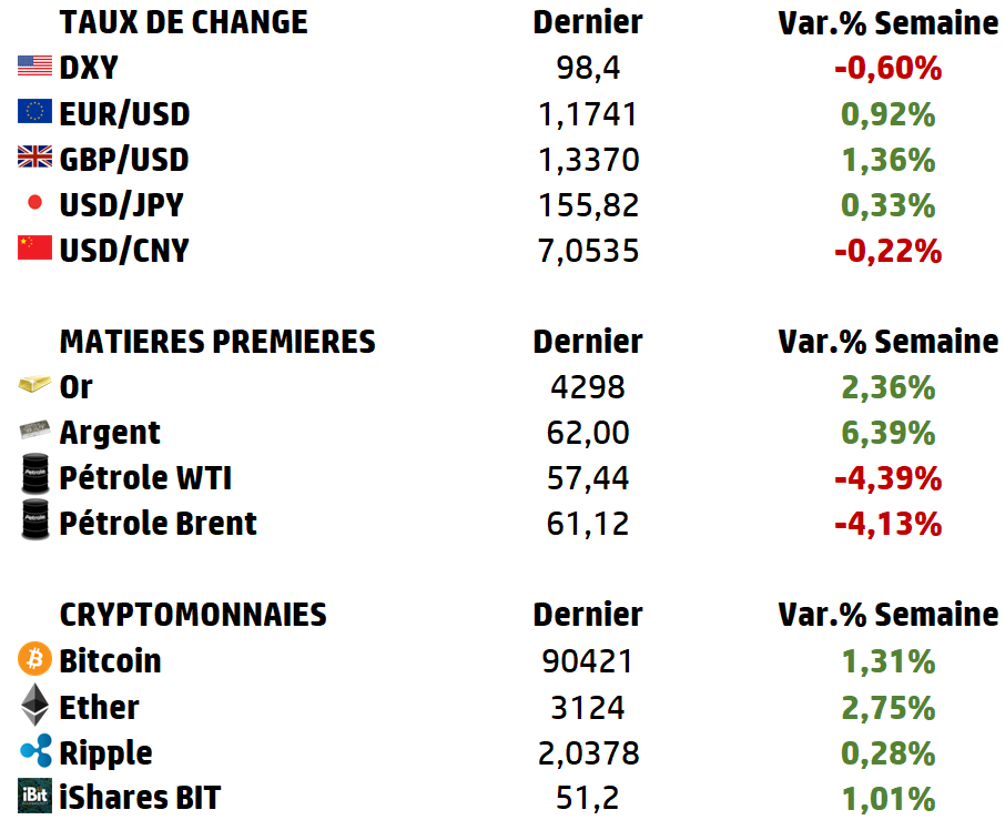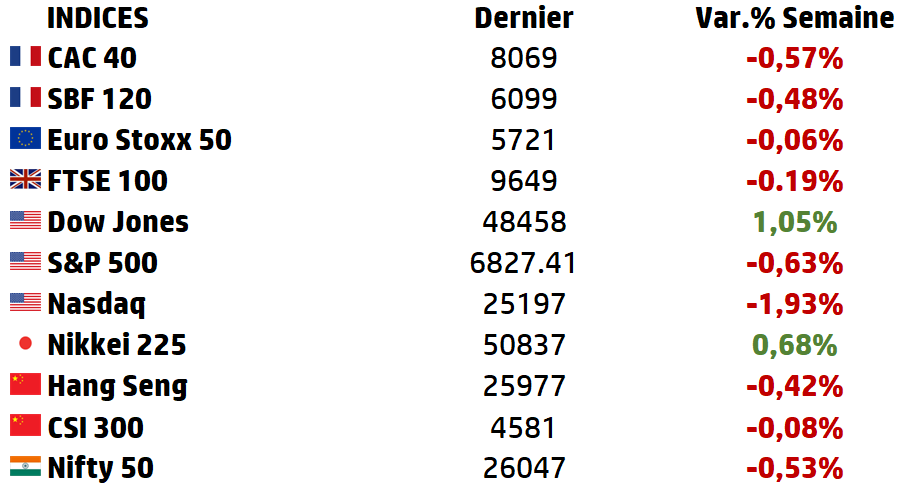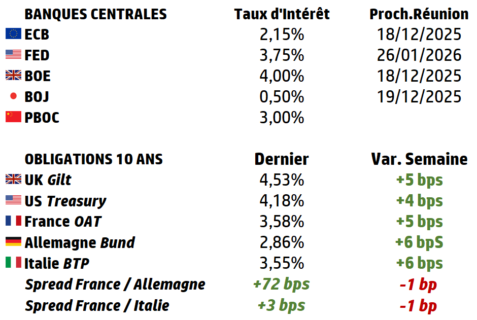 | La dernière semaine chargée de l’année sera marquée par la publication tardive des chiffres de l’emploi aux États-Unis pour le mois de novembre, ainsi que par une série d’indices des directeurs d’achat (PMI) à travers le monde et les décisions de taux de la Banque d’Angleterre (BoE), de la Banque centrale européenne (BCE) et de la Banque du Japon (BoJ). Parmi celles-ci, la première devrait suivre la Réserve fédérale (Fed) et baisser ses taux, tandis que la seconde devrait à nouveau relever ses taux d’intérêt. La BCE devrait quant à elle maintenir ses taux inchangés. Les derniers résultats de l’année seront publiés par Micron Technology et Nike aux États-Unis. |