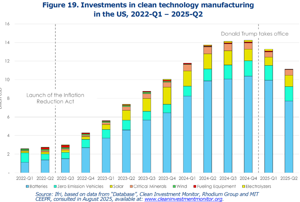 Les effets macroéconomiques estimés confirment l’ampleur du choc : la suppression des crédits IRA représente −500 milliards de dollars d’investissements dans les énergies propres sur 2025-2035 ; la seule filière solaire/éolienne perd plus de 60 milliards dès 2028. Le 7 juillet, un memorandum présidentiel ordonne même au Trésor “d’appliquer strictement la fin des subventions éoliennes et solaires”, confirmant politiquement le caractère punitif du dispositif.