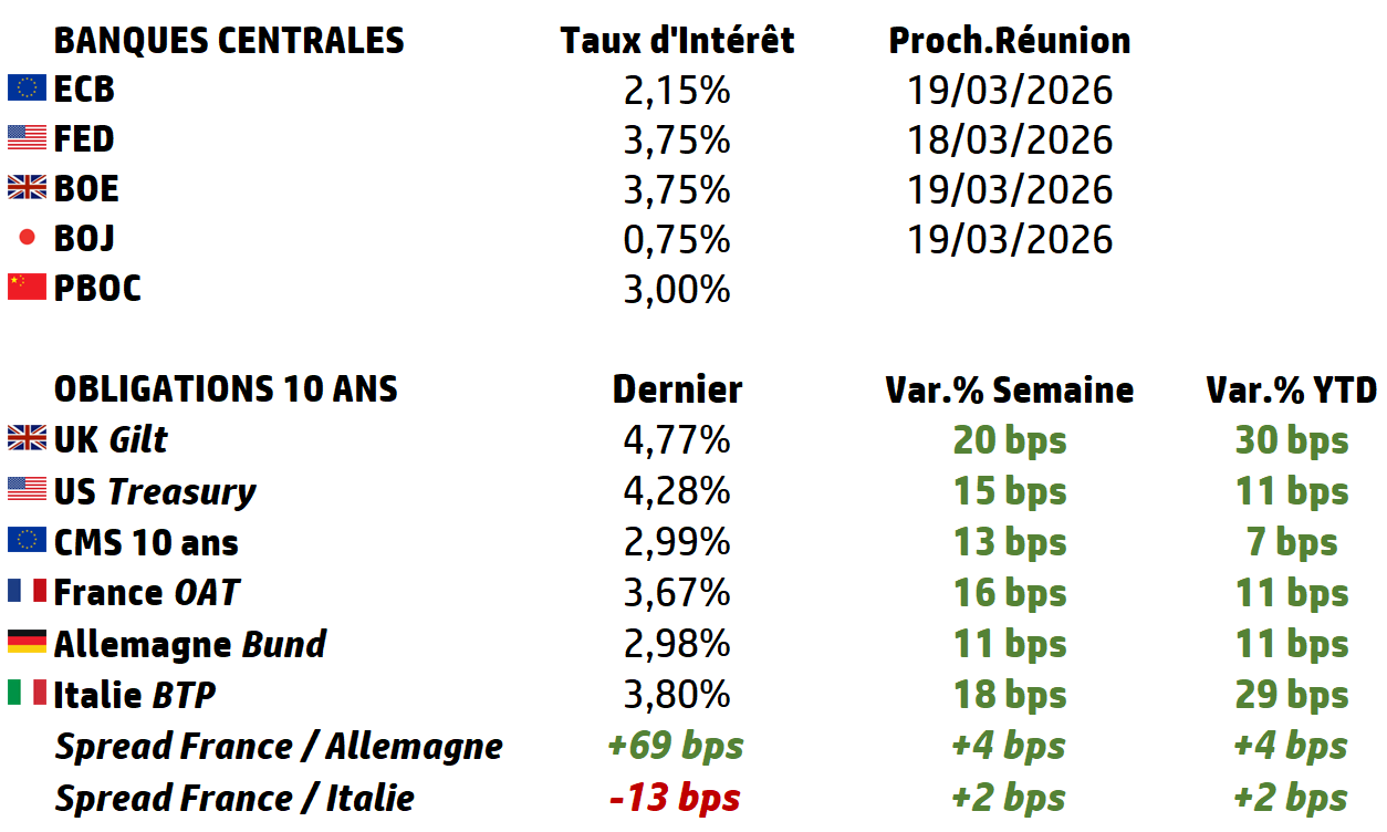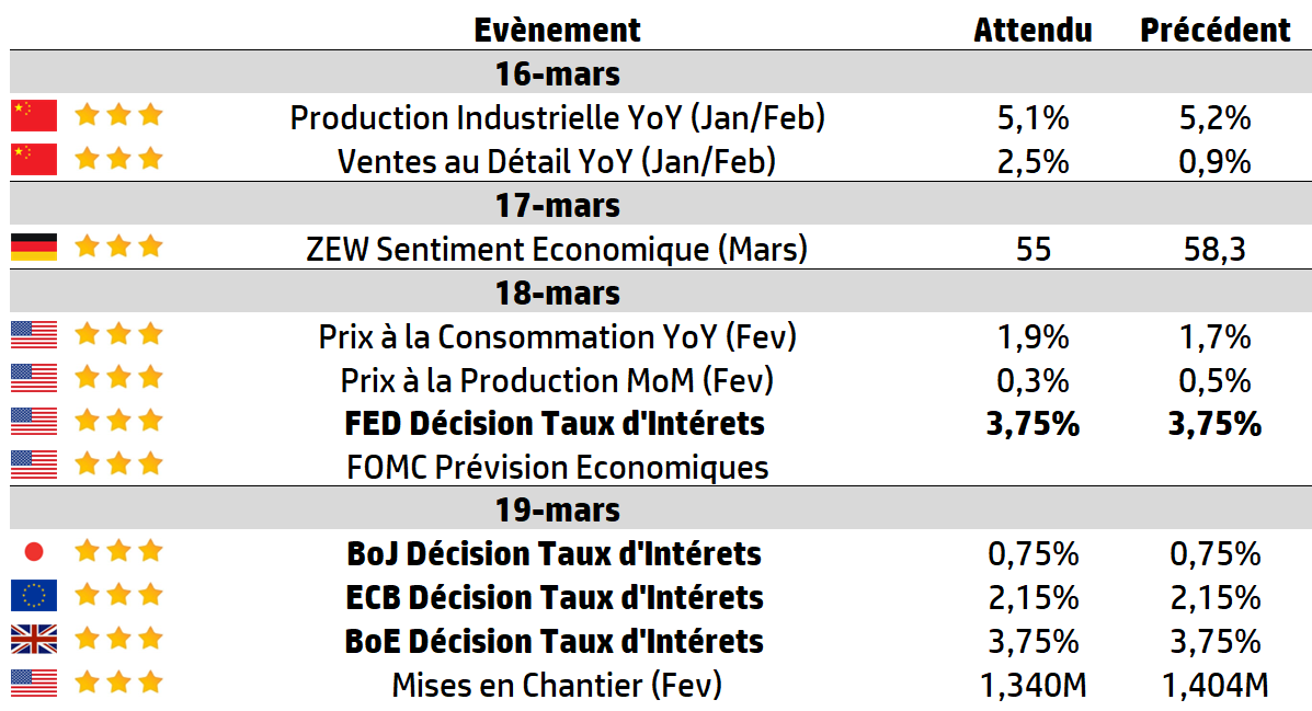 | La guerre au Moyen-Orient et la flambée des prix de l’énergie domineront l’actualité cette semaine et pèseront lourdement sur les décisions des banques centrales en matière de taux d’intérêt. La Réserve fédérale américaine (Fed), la Banque du Japon (BoJ), la Banque d’Angleterre (BoE), la Banque centrale européenne (BCE), la Banque de réserve d’Australie (RBA) et la Banque du Canada rendront toutes leurs décisions publiques. Même si aucun changement n’est attendu sur les taux, nous pouvons être sûrs que les discussions porteront sur les prix du pétrole et du gaz, ainsi que sur les perspectives d’inflation, qui auront considérablement évolué depuis leur dernière réunion. |
