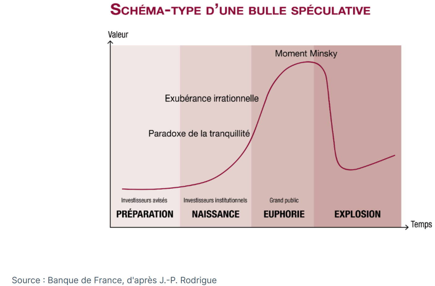 La bulle éclate lorsque les anticipations de certains investisseurs changent : ils comprennent qu’un actif est surévalué, supposent que les autres investisseurs vont eux aussi finir par s’en rendre compte et décident donc de se séparer de ces actifs avant les autres.