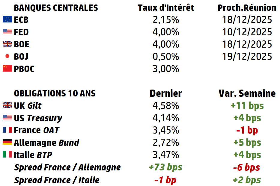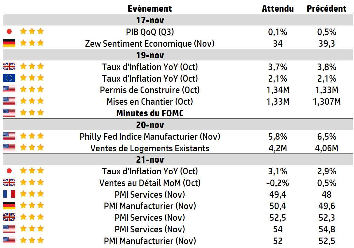 | Bien que le shutdown du gouvernement américain ait pris fin, les données américaines ne commenceront à être publiées que cette semaine. Toutefois, les chiffres de l’inflation au Royaume-Uni seront importants pour les marchés qui tentent d’évaluer les chances d’une baisse des taux d’intérêt en décembre par la Banque d’Angleterre (BoE), tandis que vendredi verra la publication des indices PMI (indices des directeurs d’achat) flash à travers le monde. La saison des résultats en France et aux États-Unis touche à sa fin, mais Nvidia, la plus grande entreprise au monde, publiera ses résultats mercredi, et de nombreuses entreprises cotées au FTSE publieront encore leurs résultats, notamment Imperial Brands et JDSports. |