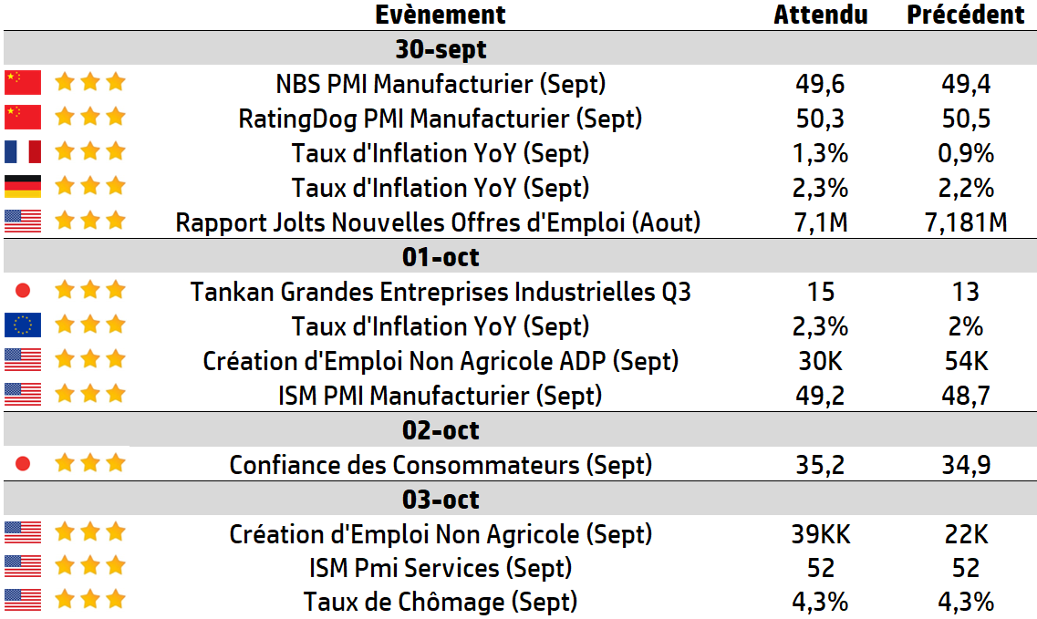 | Les chiffres de l’emploi aux États-Unis domineront l’actualité cette semaine, avec la publication du rapport ADP, des chiffres mensuels JOLTS, des demandes hebdomadaires d’allocations chômage, puis des emplois non agricoles (NFP) vendredi. Même les indices des directeurs d’achat (PMI) de l’ISM seront surveillés afin de voir si les sous-indices de l’emploi fournissent des informations supplémentaires. Les résultats intermédiaires de Tesco et le dernier rapport trimestriel de Nike seront les temps forts de la semaine en matière d’actualités corporate. |