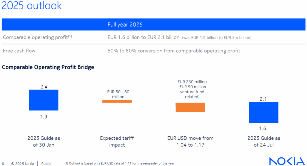 L’activité de Nokia est restée stable autour de €9 Mds de ventes, mais avec des marges plus modestes, affectées par le phasage des projets, les devises et l’intégration d’Infinera. Malgré cela, le groupe conserve une capacité de génération de cash positive et maintient une trésorerie nette solide à €2,9 Mds, confirmant sa résilience et sa discipline financière.