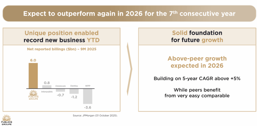 En 2025, Publicis se distingue nettement de ses concurrents (WPP, Omnicom, IPG) grâce à une stratégie structurée autour de l’IA et de la transformation digitale, lui permettant d’afficher des croissances organiques supérieures malgré un environnement sectoriel complexe.