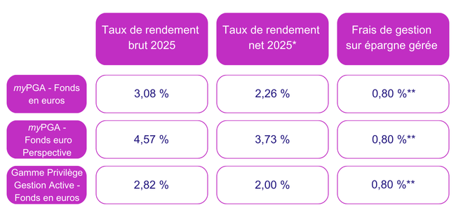 | * Taux de rendement nets de frais de gestion des contrats et bruts de prélèvements sociaux et fiscaux, hors offre promotionnelle ** Taux de chargement de gestion minimum. |